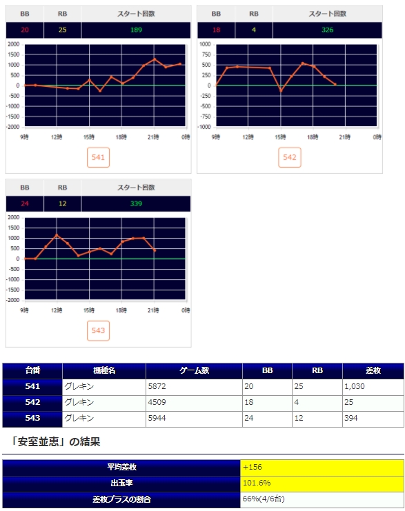 グレキンでは541番は明らかに高設定を期待出来るボーナス歴、スランプですが、この辺りもしっかり読み取って攻めるユーザーでなければ、「しっかり出玉感を感じられて、期待を持って回し続ける」という展開に恵まれなければ542番、543番同様に中途半端にプラス止めな結果にもなり、良い印象も残らないものに。