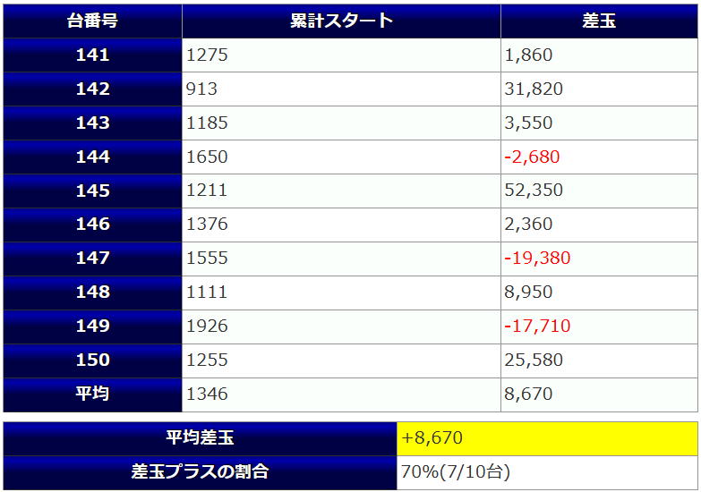 【平均差玉 +8,670発、差玉プラスの割合 70%(7/10台)】と優秀な結果となりました。