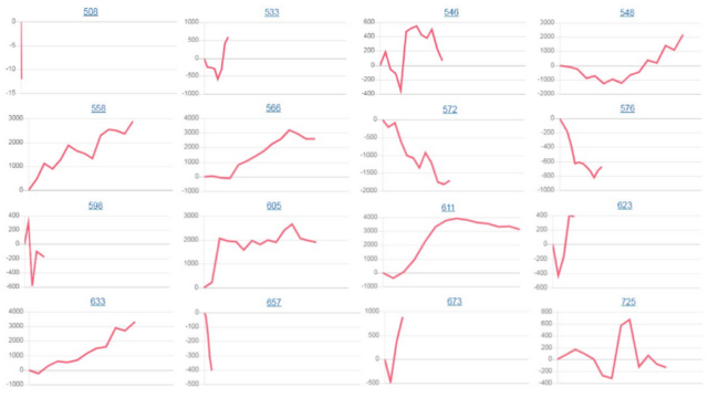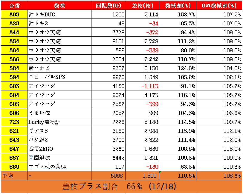 沖ドキDUOから+5,120枚、鳳凰天翔から+2,587枚と、それぞれの箇所から大きな差枚が確認されています。