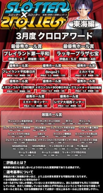 設備評価新台やデータ機器の充実度、台間シャッターや肘掛けの有無、Wi-FiやUSBの有無、休憩所や食堂の質、装飾の華やかさ
