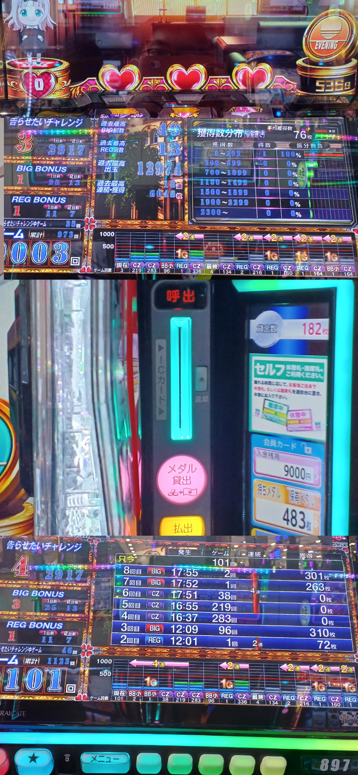 ↓下記台、予想通りその後564回転(実質464回転)回って1度も当たる事なく終了。