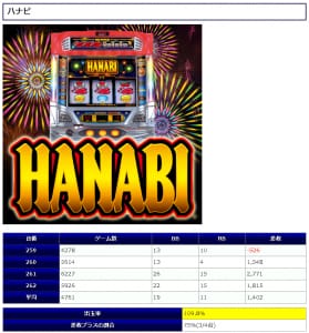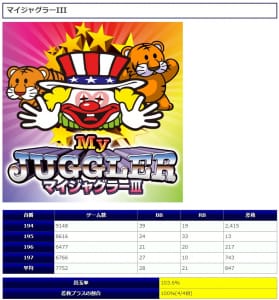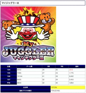 まず投入率の高いマイジャグ3ですが、しっかり朝一から回されている様子で、惜しくも1台マイナスとなってしまいましたが、出率107.0%と高い数値を残しています。