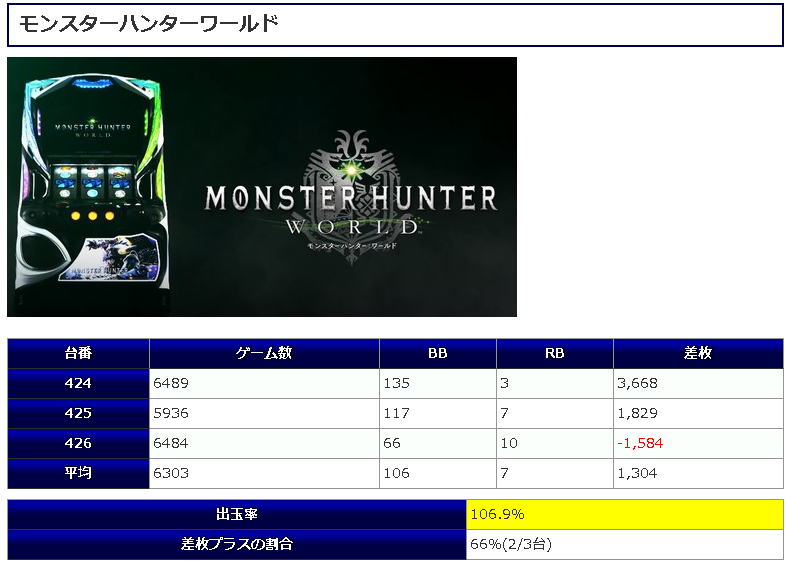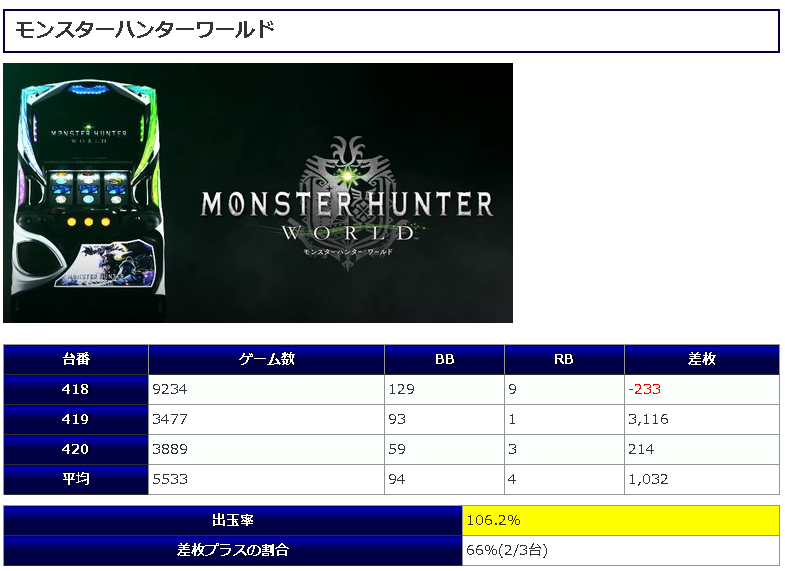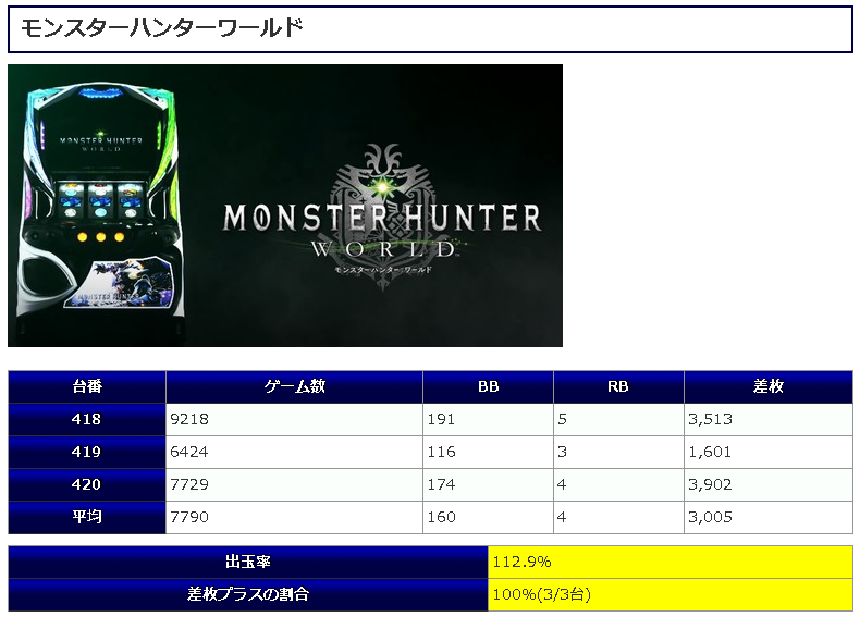 当日の狙い台としては、まずここ最近の鉄板機種化しているモンハンワールド。