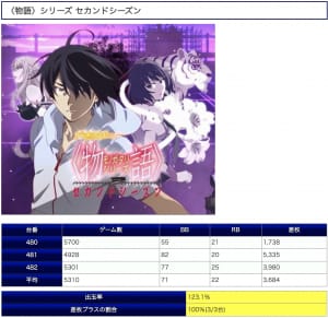 そしてこちらもお馴染み物語2ndはさらに強くて、しっかり打ち込まれての出玉率123.1%で全⑥濃厚と同店の癖を知っている常連が圧勝できる配分をしていました。