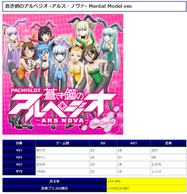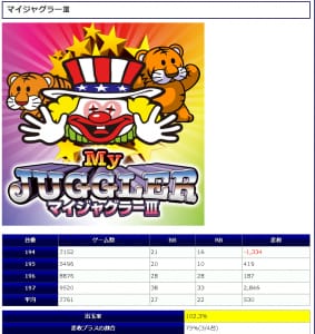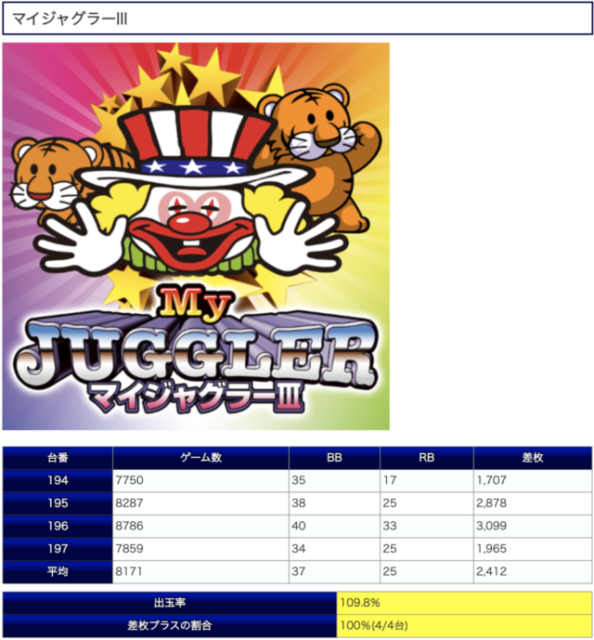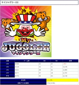 まずマイジャグ3から見ていくと、この機種はいつも対象になる定番のAタイプで、4台機種だからかニブイチでの仕掛けが多いのですが、今回は全台ブン回されて平均8171Gの出玉率109.8%と結果も優秀だっただけに全⑤⑥の可能性が高いです。