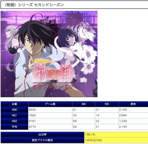 出玉率が105.8%と控えめに終わりましたが、こんだけ回されているのを見ると設定⑤⑥の不発だった可能性も大いにありますし、なんであれ今回も物語2ndを使ってくれるのは癖を知っている常連からしたら有難いです。
