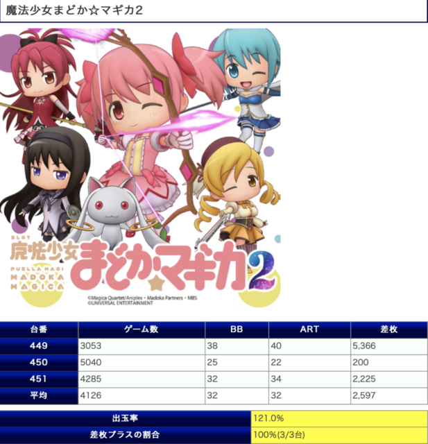 勝率3/3 平均差枚2597枚 平均4126G 出率121.0%