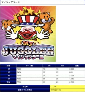 前回の8の日、マイジャグⅢが対象になっていたが、ガッツリ回されたものの出率勝率共になんとかかんとか恰好は付けた程度だったので、ここは引き続き対象にして、本来の力を見せてくれると期待したい。