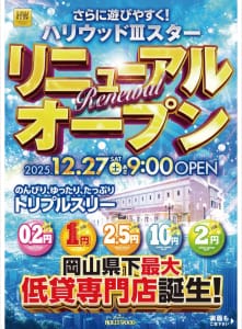 7/13 リニューアルオープンと告知してたため気になって行ってきました。まず朝の抽選は一般含めて80人前後ぐらいでこの時点でやばいと感じました。朝は5台設置のマイジャグに向かったのですが、先に入場した人が自分が狙っていた台番に座っていたため仕方なく他の台で様子見することにしました。昼頃でようやく人が多くなってきましたが、接客は他と変わらない感じで普通の評価で、設備はトイレや休憩所はそれなりに綺麗で店を出てあなのですがドリンクホルダーが開かないのがあったのでイマイチな評価にしています。最後に今回のリニューアルオープンは個人的に弱いと感じましたが、高設定ぽい台は複数台あるように感じました。店の癖さえ見抜けばこの店で稼働できると思いました。今後気になる告知をしたら行ってみようと思います。