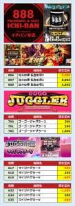 個人的な狙いはジャグラー1機種全、リゼロ、絆、まどマギ系、北斗天昇くらいかな?