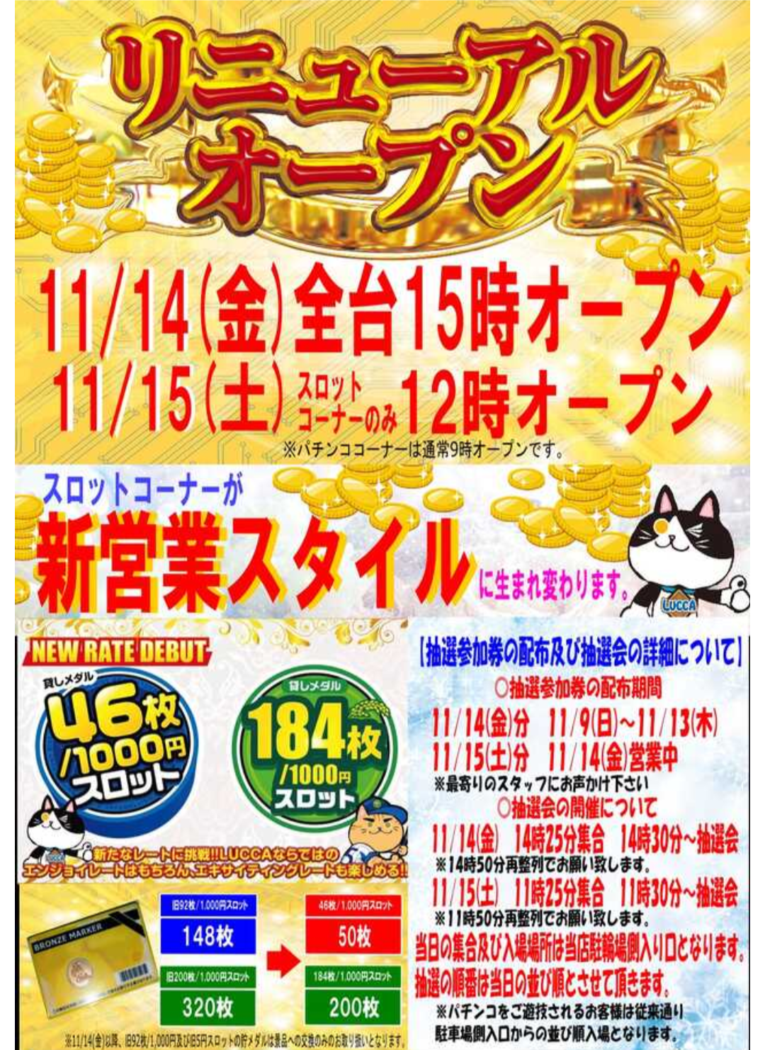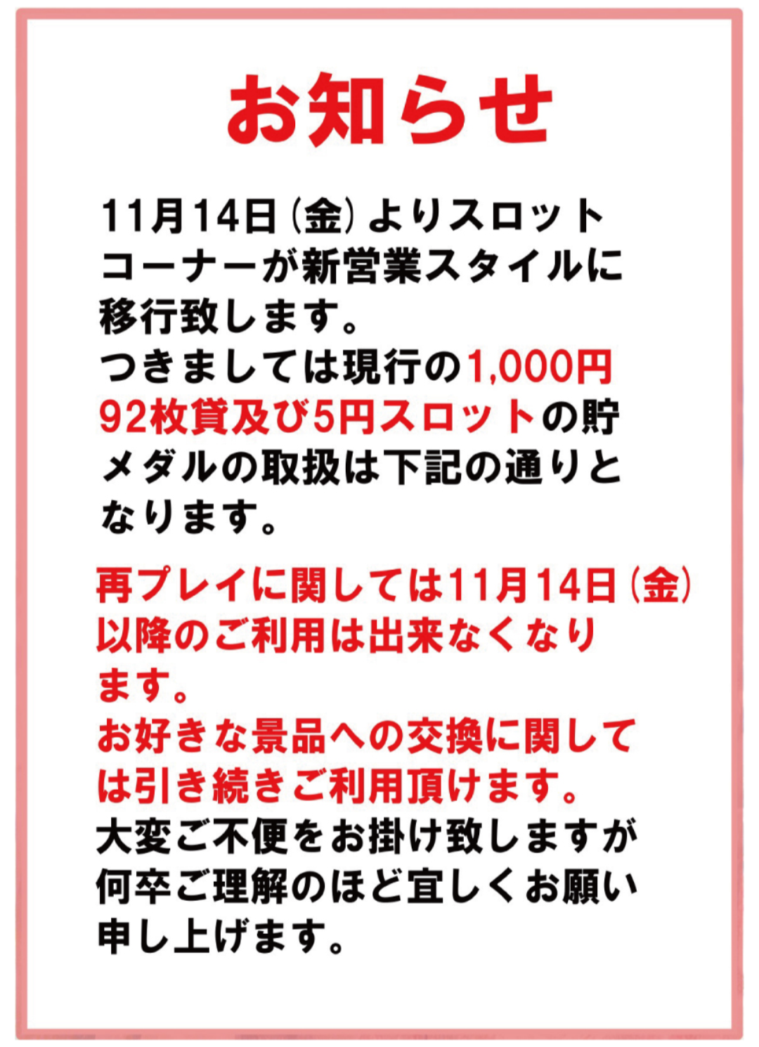 変更に伴い1000円92枚貸と5スロの貯メダルは再プレイ不可。