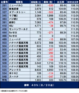 1列に1/3以上で投入されていた「鳳凰~天翔」など、稼働状況が芳しくなく台が目立ち、本領発揮出来なかった台も多かったのではないでしょうか。