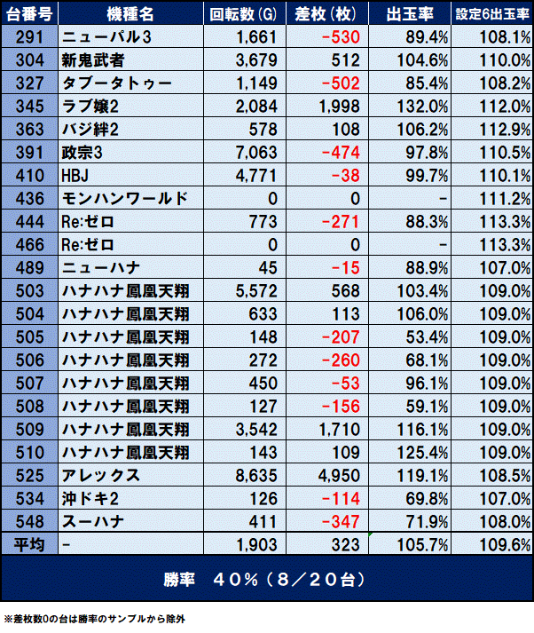 全体での結果は、平均差玉+323枚とプラスで終わることが出来良かったと思います。