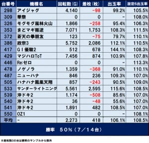 稼働状況には少し偏りはあり、全体での出玉率は105.7%とメーカー発表(109.6%)には及びませんでした。