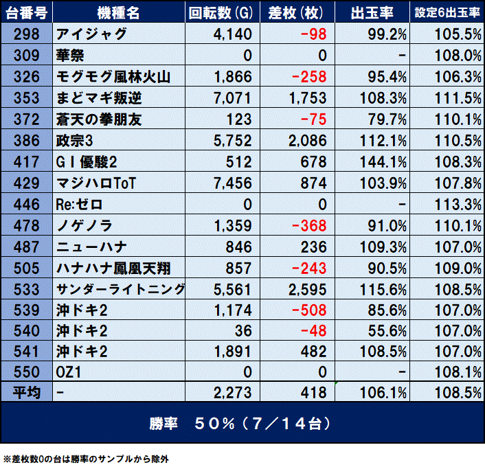 一方で、惜しくもマイナス差枚で終わってしまった台のほどんどは、稼働状況も芳しくなく本領発揮出来なかった感じでしょうか。