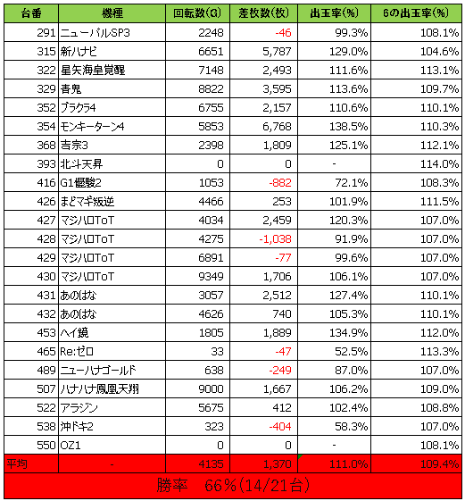 全体では、平均差枚+1,706枚(出率110.1%)という結果でした。