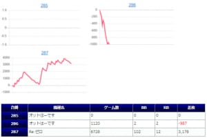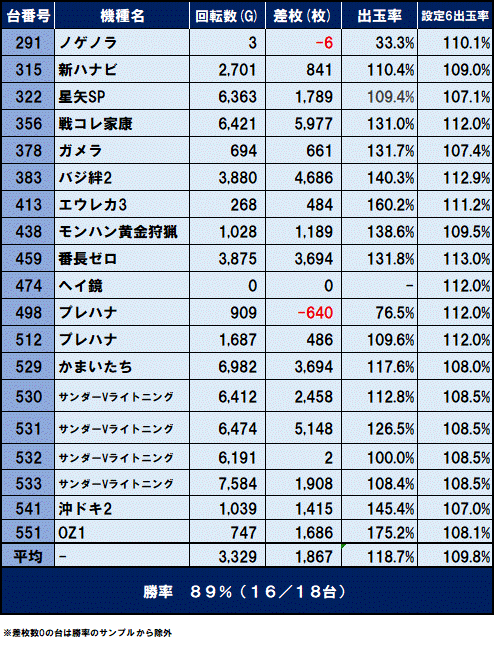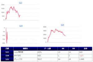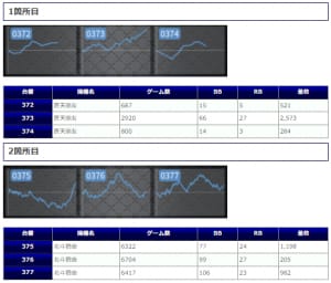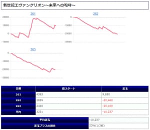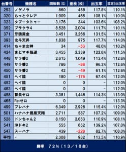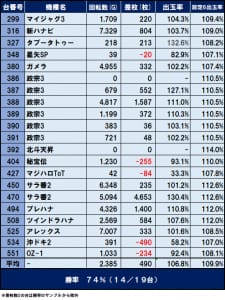 「並び系」全体での結果は、平均差+297枚(出率103.5%)とプラスになったのは良かったと思いますが、打ち込みがあまり入らない台もあり苦しい展開でした。