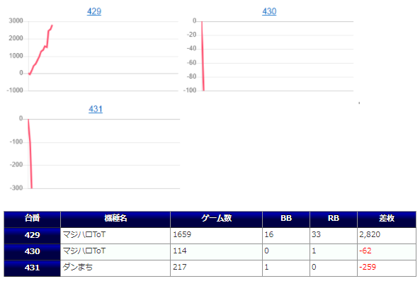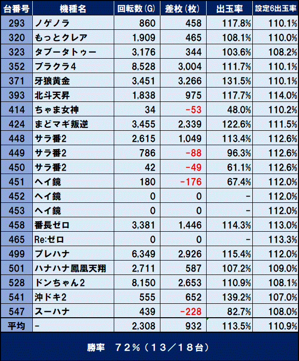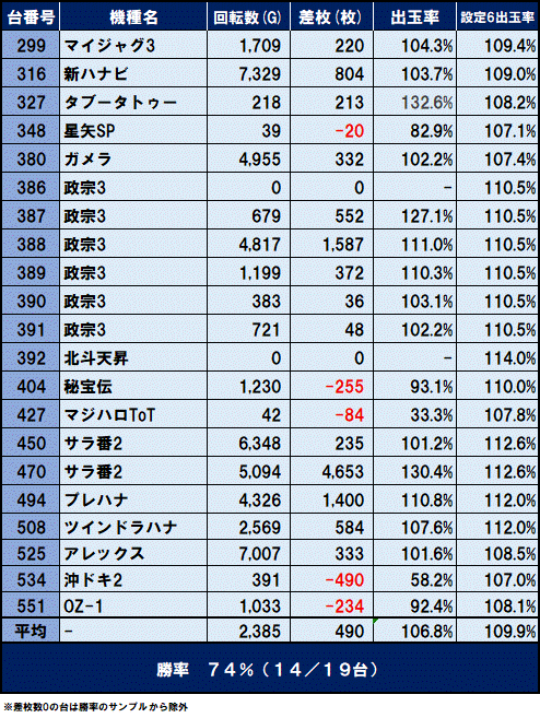 今回は「北斗宿命」3台が、割と稼働状況も良く全台がプラス差枚と信憑性の高い結果になったのではないでしょうか。