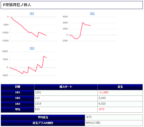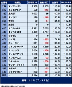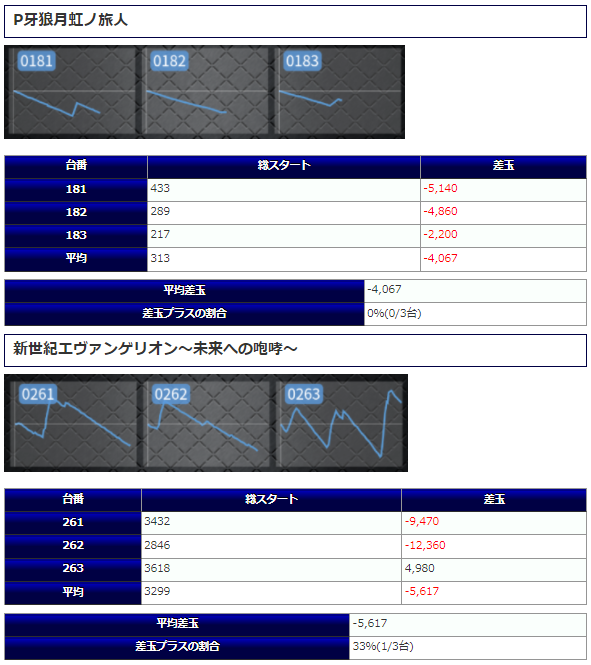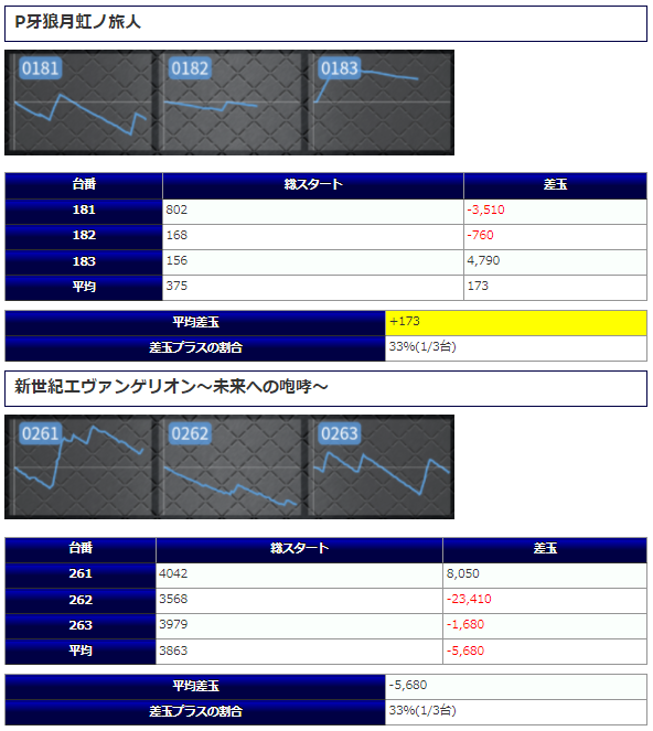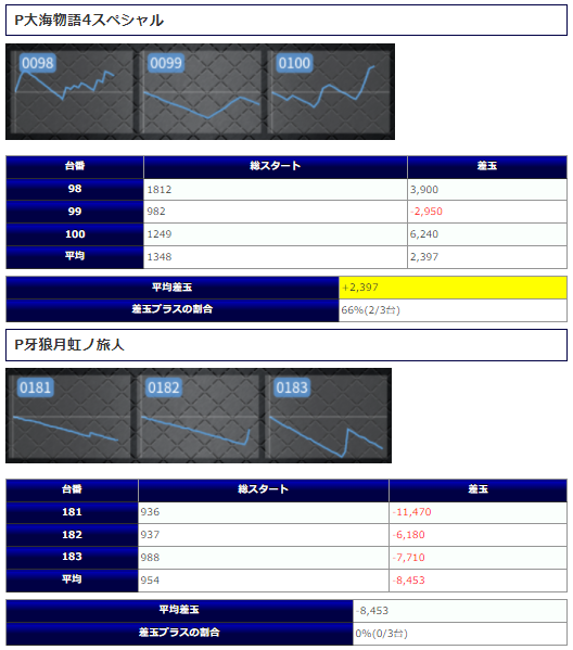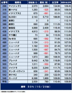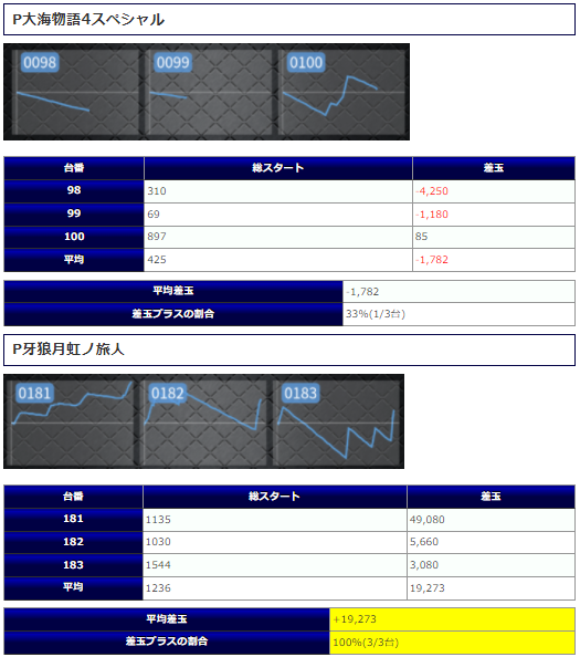 「大海4SP」「牙狼月虹」では、新台2機種に圧倒されてしまったのか、平均稼働も1,000回転以下と中途半端な状況になってしまいました。