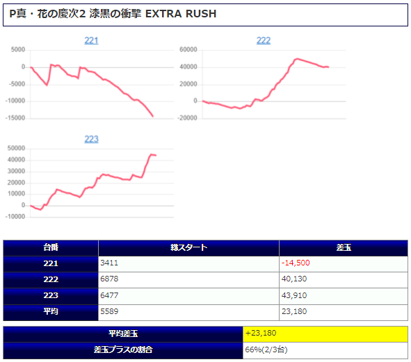 まずは新台の「慶次2漆黒EX」ですが、3台中2台が差+40,000玉overとライトミドルと思えない爆発を見せました。1台は惜しくもマイナスでしたが、平均差玉は+23,180玉と見事な結果になりました。