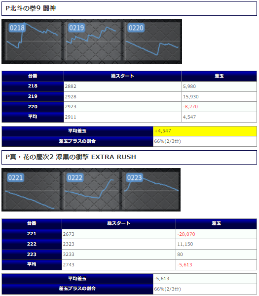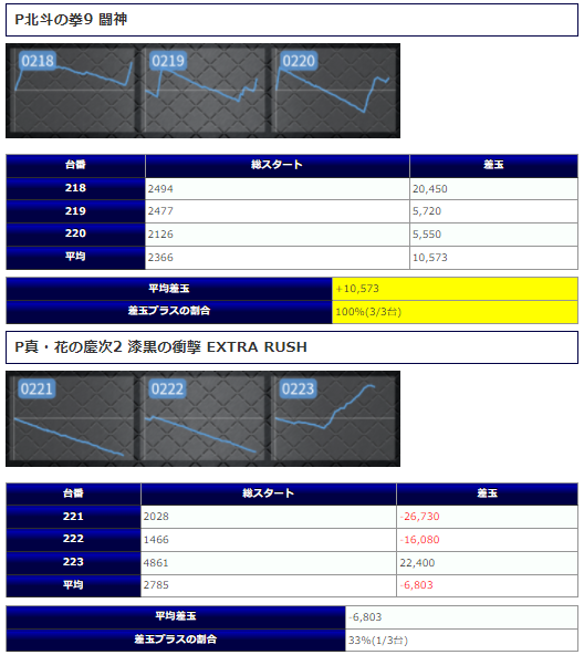 同じく新台の「北斗9闘神」では、平均稼働2,710回転とフル稼働状態で、3台中1台が差+20,600玉と健闘したものの、残り2台が差-27,700玉・差-29,440玉と大きくマイナス差玉を出してしまい悔しい結果となりました。