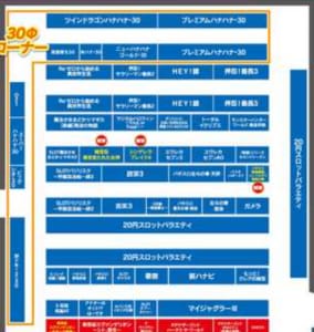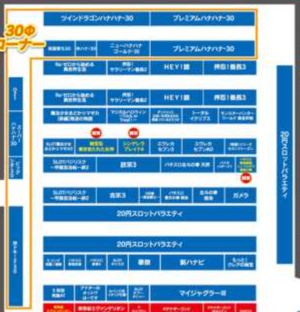 今回、公約②の1/3以上の台が⑥の列で対象だったのは「ニューハナG・プレハナ」で、486番~493番台の7台並びが対象でしたが、「ニューハナG」が思ったほど打ち込みが入らず勿体ない状況だったかなと感じます。