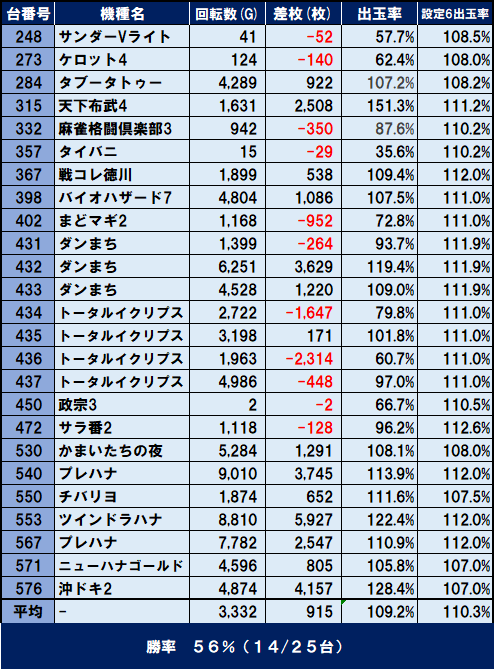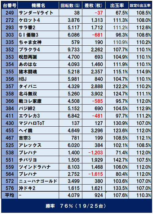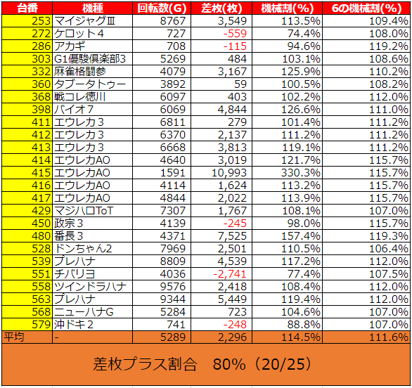 平均差枚 +2,296枚、出玉率114.5%、勝率80%(20/25台)と全ての数値が優秀で、間違いなく全⑥での営業だったと思います。