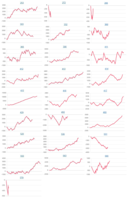 並び系全体で、平均+2,029枚、出率114.4%、勝率75%(15/20台)と素晴らしい結果を残しており、大きく差枚がついた位置が多かったので、かなりメリハリの効いた仕掛けが用意されていたのではないでしょうか。