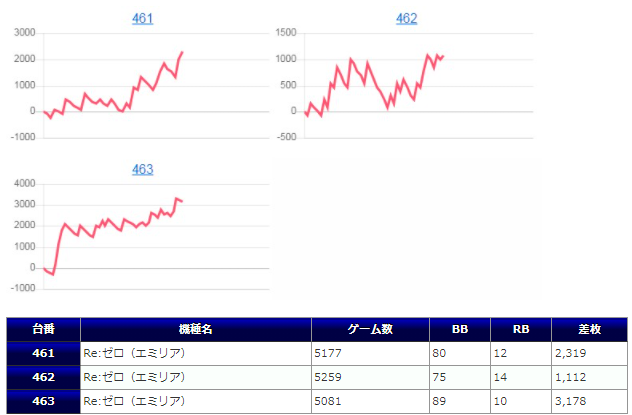 特に「リゼロ」からそれぞれのパネルで用意され、【実質全台系】であったようで、計12台で平均6178G回されて1台辺り+1,572枚、出率108.5%だったことからもしっかり⑤⑥での用意だった可能性はかなり高そうですね。