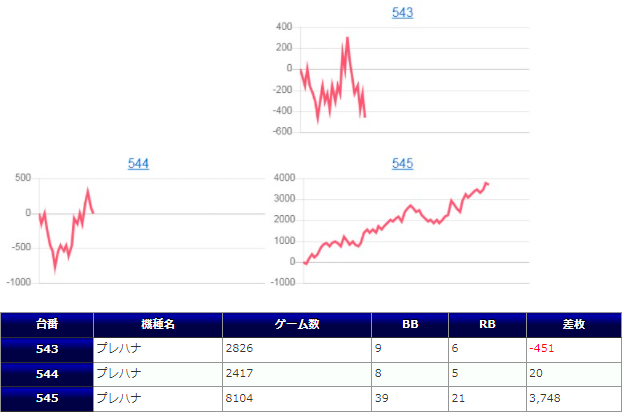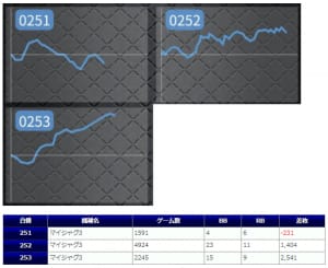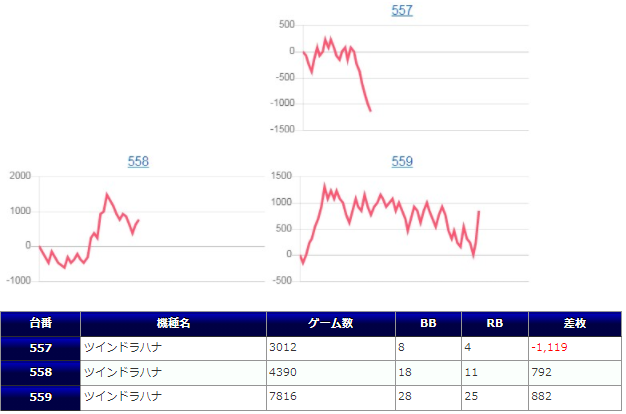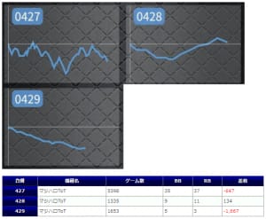 +1,000枚以上のプラスを叩き出したのは8200G回されたマイジャグ3、9300G回されたプレハナ、7500G回されたツインドラハナの3台のみで、それ以外は稼働も少なく全体的に不発になったと思います。
