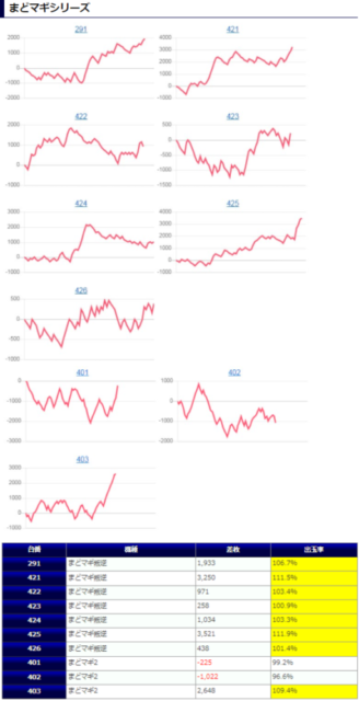 並び系全体で、平均+500枚、出率105.3%、勝率66%(12/18台)と、今回は特に低稼働な部分が目立ったように思います。