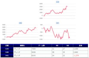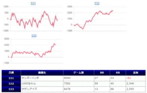 【リゼロ・政宗3】の3台並びではリゼロが+3,000枚超え、【北斗天昇】の391番台も+1,107枚を叩き出したが並び系を意識出来る程には結果もでていない。