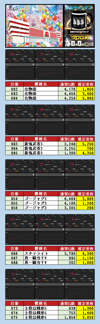 店の特定日や強演者の来店日も狙うのも良いと思いますが、今回のクロロ景品のように「狙いを明確にできる」日もとてもオススメです。
