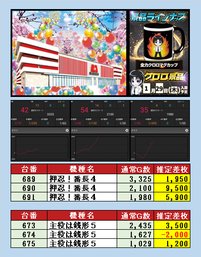 店の特定日や強演者の来店日も狙うのも良いと思いますが、今回のクロロ景品のように「狙いを明確にできる」日もとてもオススメです。