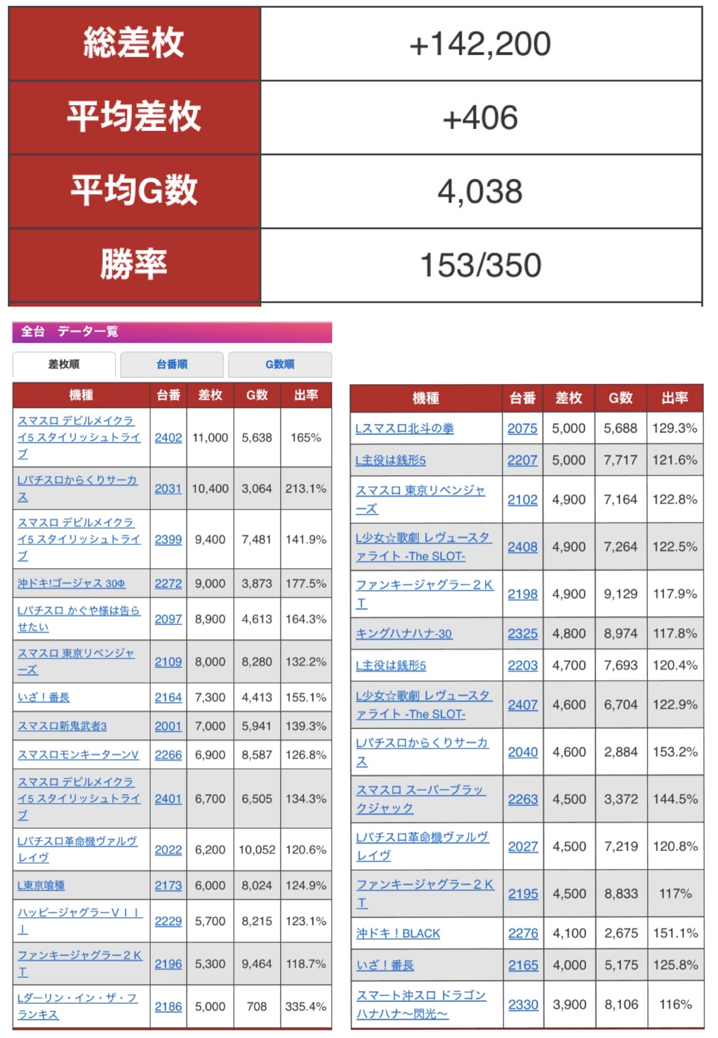 かぐや様でよくあるマイナスからの爆発も含めても、マイナス台のうち-3000枚以上が5台、-4000枚以上が3台とけっこう悲惨でした。