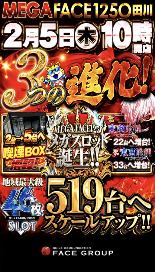 評価の前に、こちらフェイスさんの新しい店舗!先月オープンしたばかりです。福岡来ると良く行く小倉南店や宗像店との対比として見て頂けると幸いで御座います。そしてそして、お気付きの方もいらっしゃると思うのですが、各台灰皿が有りません。そう!4月より禁煙です!これには小生辛いとこあるのですが、この環境に慣れないと!と思い、禁煙で実戦!灰皿借りて吸ってる人多数でしたが、、、我慢して禁煙実戦です!