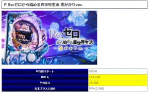 事前ピックアップ2機種より「リゼロ鬼がかり」が対象となりました。平均3,348回転と高レベルな打ち込み量を魅せてくれましたが、結果の方は平均差玉-4,853発と惜しくもマイナス結果となってしまったようですね。