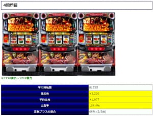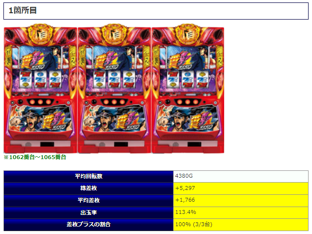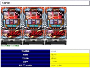 1台のみプラス結果となったようですが大半の台がマイナス結果となってしまったようで、上手く結果に結びつかなかったようですね。そんな中でも平均3,348回転としっかりと粘っている台が多くなっている事からもただ単純に人気台だからという理由だけではない、環境の良さも伝わってくる内容と判断して良さそうですね。