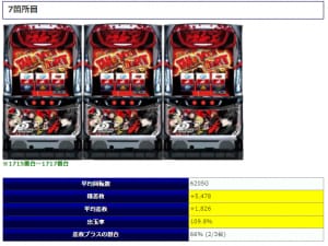 ⑦箇所目で対象となった「ペルソナ5」では平均6,205回転とこちらもやや余力を残す内容とはなりましたが平均差枚+1,826枚と高レベルな内容を魅せてくれました。惜しくも1台はマイナス結果となってしまったようですが、両台でこれだけの内容ならば中身のレベルは高いものであった事は間違いなさそうです。
