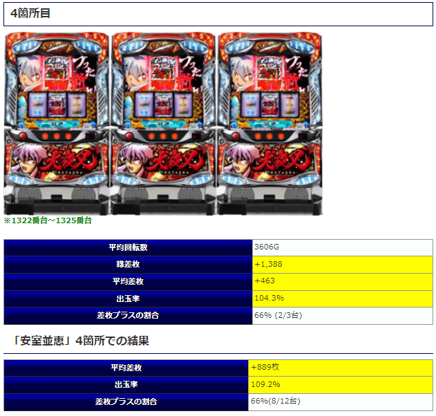 そして③~④箇所目で対象となった「チバリヨ」ですが、②箇所目:平均差枚+1,293枚、③箇所目:平均差枚+2,777枚、④箇所目:平均差枚+2,984枚とそれぞれで高レベルな内容を披露していますね。中にはマイナス差枚となってしまった台も見受けられますが、打ち込み量も3,000~4,000回転ほどまで粘っている箇所が多くなっており、内容の良さが伝わってくる結果と言えるでしょう。
