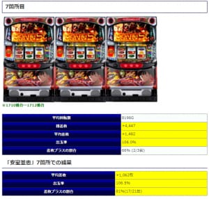 最終的な結果としては平均差枚+1,699枚、平均出率111.4%、勝率71%と高水準な結果となりました。どうやら光るんと対象台が少々被っているようですね。