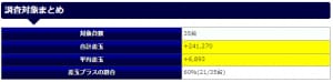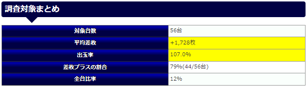 『みんレポ』で数値を確認してみても「ケツ番ゾロ目」の台がしっかりと反応を示しており、この共通点を見出せたユーザーは笑顔で帰れた事でしょう。最終的な結果としては平均差枚+1,728枚、平均出率107.0%、勝率79%となっており、対象となったほとんどの台がプラス結果となり、満足度の高い一日となったようですね。