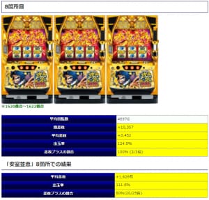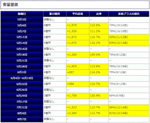 内容を見てみると、今回際立った結果となったのは「ルパン2000カラット」でしょう。全台差玉プラス結果となっており、+33,840発、+23,730発、+17,050発と目に見えてわかる好結果となっており、一際目立つ存在となっていた事でしょう。