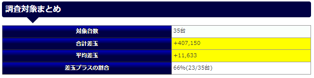 上記の計10機種での開催となりました。幅広い機種での開催となり、話題性の高い「サラ金」も対象となりましたね。最終的な結果としては平均差玉+11,633発、合計差玉+407,150発、勝率66%(23/35台)と総35台で平均差玉で万発を超える大変優秀な結果となりました。