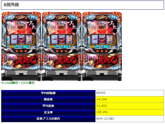 ⑥箇所目の「犬夜叉」では平均8,693回転と終日の粘り込みを魅せており、平均差枚+1,403枚となりました。1台は惜しくもマイナス差枚となってしまったようです。やや少ない差枚に感じてしまいますが、『荒い』という印象である当機においてこれだけの安定感を魅せているという事は高品質な中身であったのは明白でしょう。