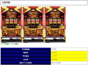 ①箇所目の「ホウオウ天翔」では平均7,175回転と高レベルな打ち込み量となっており、平均差枚+1,191枚と安定感のある結果となりました。1台は惜しくもマイナス差枚とはなってしまいましたが、2台でこれだけの内容ならば中身の質は確かなものであったと言っていいでしょう。
