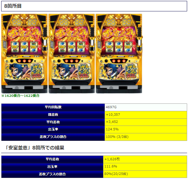 そして、「真一騎当千」でも713番台で差玉+29,540、711番台で差玉+14,010発と両台でしっかりと魅せてくれました。1台のみマイナス差玉とはなってしまいましたが打ち込み量も高レベルなものとなっていたようですので信憑性の高い結果と見て良さそうです。