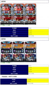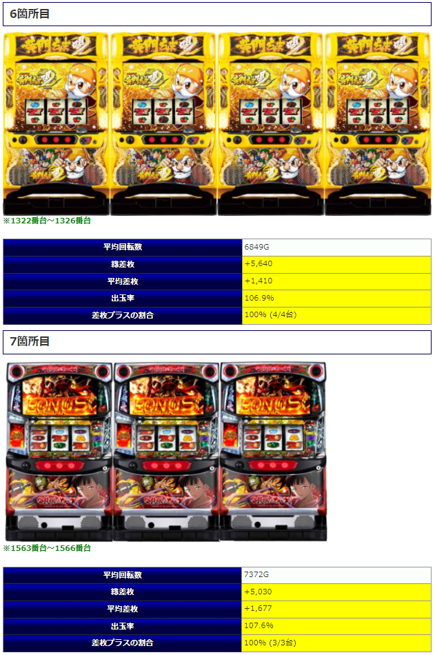 そして②~⑤箇所目で対象となった「沖ドキDUO」「チバリヨ」においては総じて平均2,500回転前後のやや控えめな打ち込み量となっており、平均差枚も+1,000~2,000枚前後を記録する内容となっており、少ない回転数ながらもそれぞれで安定の差枚を獲得したようです。それぞれで各1台マイナス差枚となってしまったようですが一撃性に特化したゲーム性上、荒れやすい印象がありますのでこのような結果も致し方ない部分かもしれませんね。