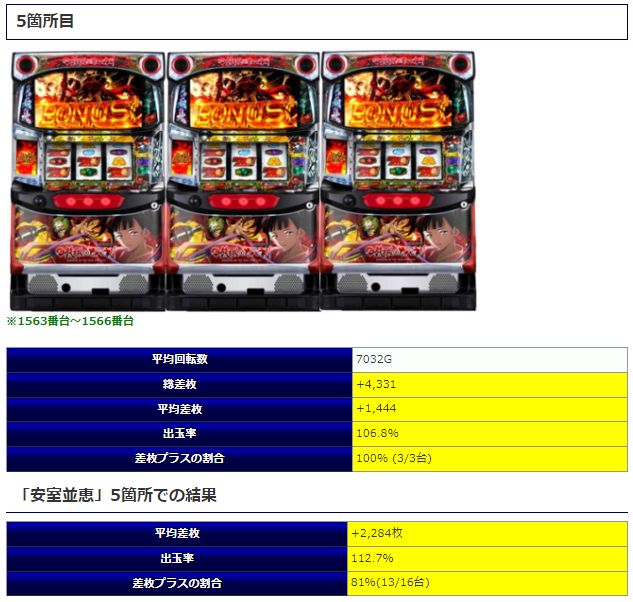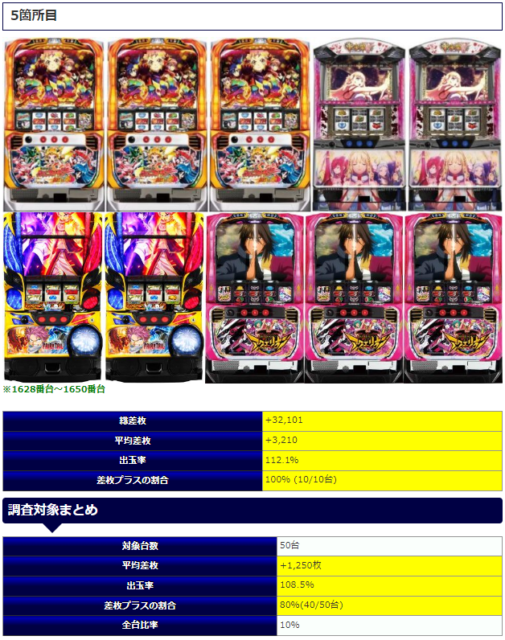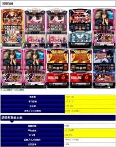 そして⑤箇所目では平均差枚+1,816枚、平均出率107.4%、勝率80%となりました。対象機種を見てもユーザーが好むラインナップとなっており、差枚はもう一声ほしかった部分はありますが、比較的勝利率も高くなっており十分闘える環境であったと思います。