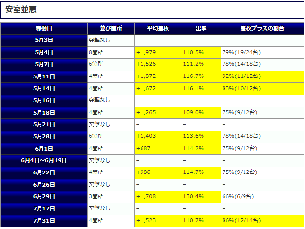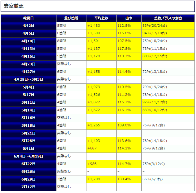 最終的な結果としては平均差枚+2,284枚、平均出率112.7%、勝率81%と高レベルな結果となりました。話題性の高い『6.5号機』が対象になったり『4台並び』が確認できたりと大いに盛り上がる内容となりました。